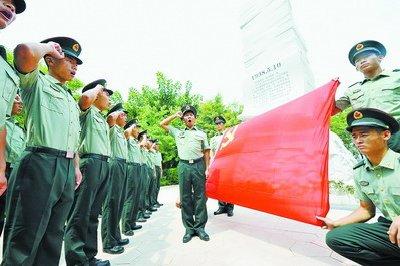 為紀念中國人民抗日戰爭勝利69周年,昨日,廈門警備區某偵察大隊組織官兵來到日寇侵犯廈門登陸遺址,開展“銘記抗戰歷史,擔當強軍使命”活動。官兵們回顧歷史,悼念在抗戰中犧牲的革命先烈,并舉行入黨宣誓。(本報記者 李曉平 通訊員 吳振洲 攝影報道)