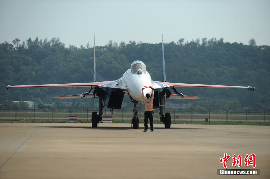 俄羅斯勇士飛行表演隊蘇27抵達珠海航展現場。陳海峰 攝