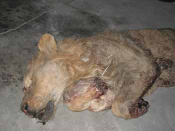 為了配合公安機關偵查,李滿堂將已經包裹好的獅子尸體重新打開,從獅子的表情可以看出死時很痛苦,李滿堂說,大約在最近幾天,他便發現籠中的兩頭獅子有些不對勁,整日無精打采,不愛吃食。開始以為獅子患了感冒,給獅子吃了些消炎藥,但隨后兩天獅子仍然不見好而且厭食情況一天比一天嚴重,并開始出現嘔吐癥狀,隨后公園工作人員將嘔吐物送至丹東市動物檢疫站化驗。