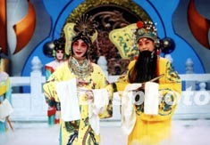 著名京劇表演藝術家梅葆玖與影壇名人盧燕女士,在“2003中央電視臺春節聯歡晚會”彩排中表演京劇《太真外傳》。作者:王新