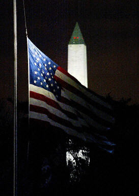 美國(guó)東部時(shí)間2月1日上午9:00(北京時(shí)間1日晚10:00),就在“哥倫比亞”號(hào)航天飛機(jī)即將返回佛羅里達(dá)州的肯尼迪航空中心前數(shù)分鐘,該飛船突然發(fā)生分裂解體現(xiàn)象,有碎片從飛船上落下。機(jī)上7名宇航員沒有生還的跡象。圖為:美國(guó)華盛頓降半旗紀(jì)念哥倫比亞號(hào)失事宇航員。