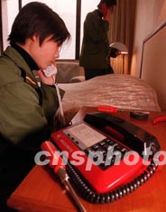 北京保障京西賓館通信的解放軍女兵,目前正在緊張檢修電話,以確保參加中國人大和政協“兩會”的代表、委員通信萬無一失。作者:宋吉河