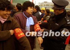 北京市東城警方二十四日舉行“警民聯防保安全”大會,發動群眾協助警方做好“兩會”安全保衛工作。目前北京市已有四萬多名“紅袖標”在街道、社區巡邏值勤。作者:宋吉河
