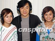 香港藝人成龍、音樂組合TWINS,三月三日在香港為影片《千機變》主題曲錄音。錢興強 攝