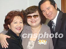 香港藝員沈殿霞三月五日接受香港新城電臺“家天下”訪問。圖為沈殿霞與主持人薛家燕(左)、該臺總監甘國亮(右)興高采烈一起拍照。中新社傳真 錢興強 攝