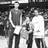 在14日晚火箭隊與公牛隊開賽之前,黃朱惠愛女士帶著她那也是“姚明小球迷”的孫子一道走向了姚明。她代表德州州長培瑞和州政府及州議會向他頒發了祝賀狀,姚明十分高興地從這位當地著名的華裔女議員手中接過了祝賀狀。