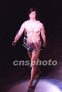 三月二十六日,有“今日青年潮流指標”之稱的卡賓服飾在北京電影制片廠攝影棚內舉行時尚男裝秀,欲以別致的舞臺效果掀起全新時尚風暴。圖為卡賓演繹透明男裝。作者:武仲林