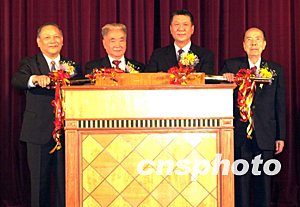 何厚鏵、原全國人大常委會副委員長王漢斌、全國政協副主席馬萬祺及中央駐澳聯絡辦主任白志健在酒會為紀念《澳門基本法》頒布十周年電視特輯首播儀式揭幕。作者:李剛