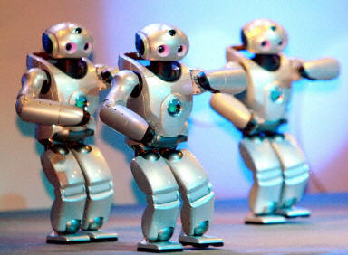 圖為日本索尼公司人形機(jī)器人SDR-4X II在“2003機(jī)器人展覽會(huì)”上展示跳集體舞技能。
