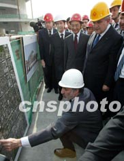 國務院總理溫家寶二十五日陪同法國總理拉法蘭參館國家大劇院工地時,聽取設計師介紹情況。作者:滿會喬