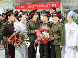 下午2時,304醫院舉行莊嚴而簡短的歡送儀式。記者看到,30名英姿勃勃的醫療隊員在全院戰友的鮮花和掌聲中登上汽車,院領導親自送他們赴定點醫院。記者還在海軍總醫院、307等醫院的政治部門看到了數千份請戰書、決心書。