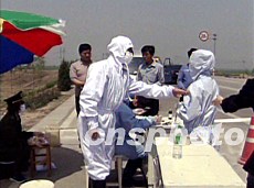 中國交通部五月再令各地迅速采取措施,嚴防“非典”向農(nóng)村擴散。圖為交通部門在路口設立衛(wèi)生檢查站,對車輛人員進行檢查消毒。作者:中新社