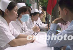 福建省立醫院護士,十二日在街頭向市民宣講嚴防“非典”科普知識。作者:劉可耕