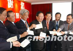 為表彰香港前線抗炎醫護人員,香港六百多個民間團體首次大聯盟,五月十三日在香港共同發起“香港是我家──支持前線醫護人員籌款活動”。圖為香港民政事務局局長何志平出席捐款儀式,對捐款者表示感謝。中新社傳真 錢興強 攝