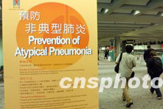 近日,香港“非典”疫情逐漸趨于穩(wěn)定,香港機(jī)場管理局仍嚴(yán)格執(zhí)行各項(xiàng)預(yù)防“非典”措施,圖為機(jī)場隨處可見醒目的預(yù)防“非典”標(biāo)語。中新社傳真 錢興強(qiáng) 攝