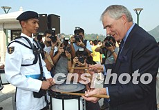 五月二十一日,香港房屋委員會將赤柱美利樓地段海旁命名為“匯豐海濱走廊”,以表彰匯豐熱心公益及樂善好施的精神。據(jù)悉,三十五年來,匯豐及匯豐銀行慈善基金已透過公益金捐款港幣八千六百多萬。圖為香港上海匯豐銀行主席艾爾敦太平紳士在匯豐海濱走廊擊鼓慶賀。中新社記者:潘索菲