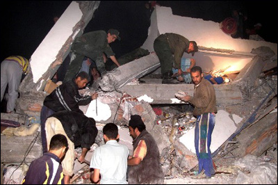 在阿爾及利亞首都阿爾及爾,救援人員在一棟倒塌的樓房廢墟里尋找幸存者。