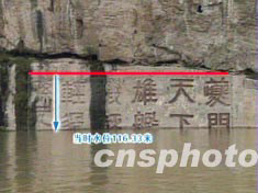 三峽水利樞紐壩前水位6月6日上午10時(shí),達(dá)到121.41米。瞿塘峽平湖景象已呈現(xiàn)出來,而三峽著名的夔門摩崖石刻此時(shí)已經(jīng)被淹沒。圖為6月4日當(dāng)水位達(dá)到116.33米時(shí),夔門摩崖石刻向游人展示出告別前的景觀。中新社 圖