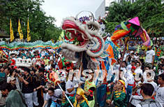 六月十五日在香港舉行的千人舞龍舞獅大巡游中,一條二百五十尺長龍穿街走巷,成為活動中一道亮麗風景。潘索菲 攝