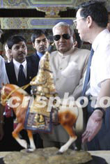 印度總理瓦杰帕伊二十四日參觀北京故宮博物院,陪同參觀的故宮博物院院長鄭欣淼向瓦杰帕伊贈送彩陶工藝品“乾隆皇帝閱兵像”。中新社記者:毛建軍
