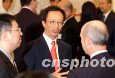 香港特首董建華、財(cái)政司長(zhǎng)梁錦松及投資推廣署長(zhǎng)盧維思,6月24日在禮賓府特設(shè)酒會(huì),舉杯祝賀來港投資的中外企業(yè)代表在港開業(yè)擴(kuò)充業(yè)務(wù)。 中新社記者 洪少葵