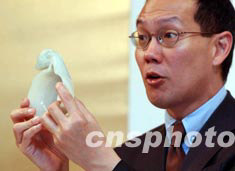 香港佳士得2003年春季拍賣會之《中國宮廷御制藝術精品》因受SARS影響延遲至7月7日舉行,亞洲區主席林華田6月26日介紹一套珍貴的清朝康熙御用田黃玉石印章,估價成交逾二千萬港元。中新社記者 洪少葵