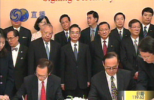 今天,CEPA提前一日在香港禮賓府正式簽署。作為推動者之一,上任甫百日的國務院總理溫家寶親自見證了這歷史性的一刻。