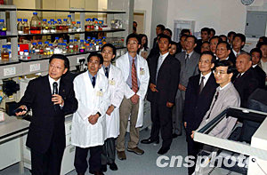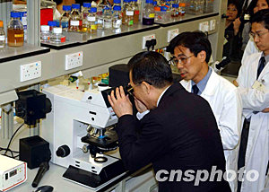 六月三十日,國務院總理溫家寶參觀香港大學基因中心,并聆聽教授介紹,如何首先找到SARS冠狀病毒。中新社記者 潘索菲 攝