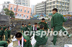 四日,數百名武警冒著酷暑進行上海軌道交通4號線滲水事故搶險,一度被黃浦江潮水沖出缺口的堤壩已經得以加固。作者:湯彥俊