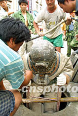 四日,上海軌道交通4號線事故搶險工作正加緊進行,一位身穿潛水服的搶險人員正準備從窨井深入水下進行作業。作者:湯彥俊