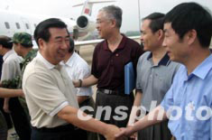 七月五日,國務院副總理回良玉乘專機抵達安徽阜陽機場,前往淮河抗洪前線,看望受災群眾,查看災情。中新社記者:盛佳鵬