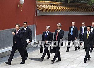 英國首相布萊爾一行七月二十一日下午步入北京中南海,會見中央軍委主席江澤民。中新社記者:賈國榮