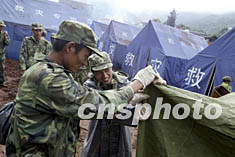 數百名解放軍官兵二十三日在云南省大姚縣曇華鄉地震災區為災民搭建帳篷,幫助當地受災民眾抗震救災。中新社記者:毛建軍
