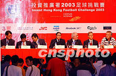 香港投資推廣署2003足球挑戰賽將在7月27日在大球場舉行,香港足球總會會長霍震霆、投資推廣署署長盧維思、利物浦領隊侯利亞等7月25日在君悅酒店出席記者會。作者:洪少葵