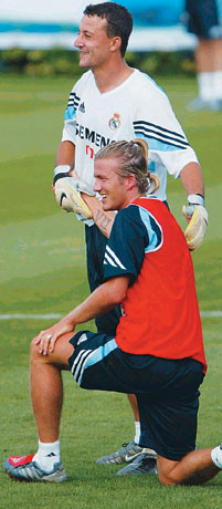 在隨后11打11的大對抗中,小貝仍然被分在替補一組,表現平平。在后衛的緊逼之下,小貝在曼聯時那種姿態優雅的傳中根本看不到。而在一次回防時,小貝竟將齊達內的傳球鏟進了自家大門。這個烏龍球也成了小貝在昨天訓練中唯一的收獲。