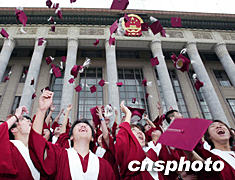 北京中加學(xué)校2003畢業(yè)典禮八月二日在北京人民大會(huì)堂舉行,三百一十一名高中學(xué)生及三十六名BTM、IHM專業(yè)的學(xué)生畢業(yè),高中畢業(yè)學(xué)生報(bào)考外國大學(xué)的升學(xué)率達(dá)到百分之百。圖為畢業(yè)的學(xué)生們在人民大會(huì)堂外歡呼慶祝。中新社記者:毛建軍