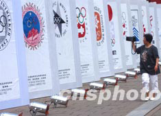 北京2008年奧運會徽八月三日夜大白天下后,引發(fā)中國民眾的關(guān)注。一名市民用攝像機拍攝下歷屆奧運會會徽的宣傳畫。中新社記者:賈國榮