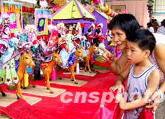 農歷七月初七是廣州民間傳統節日“七姐誕”,廣州番禺區譚山村的村民在村中的藍球場上大擺展臺,熱鬧非凡,展臺上擺滿了一套套傳統故事的人物公仔維妙維肖,展現了嶺南民間文化的藝術特色。作者:廣東分社羅仰明