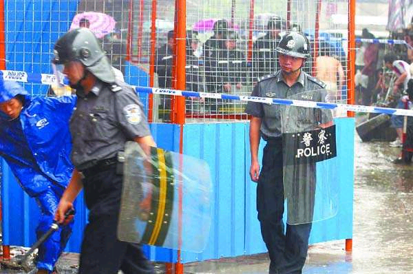 記者接到報料后于昨日上午10時30分左右趕至黃沙水產市場,只見市場門外都有多名警察和保安在執勤,大門內則有60多個身穿迷彩服的男子,手持鋼管、木棒等物并全部戴著白手套。據目擊群眾介紹,這些人員在當天上午8時左右進入黃沙市場后,就突然拿起身邊的木棒與鐵管向市場內搭建的地皮沖去,在市場口,20多名該市場保安與其發生對峙。隨后,就有當地派出所的警察趕至現場維持秩序。但趕來的警察也制止不了混亂的場面。幸虧10分鐘后,10多名身穿防暴服、手持防暴器材的警察趕至現場,成功將準備鬧事的人群分開。