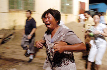 民工李建華的姐姐李寶珠看到被救出的弟弟腿斷了,悲痛欲絕
