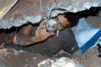 消防人員正在搶救壓在廢墟中的民工李建華