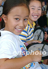 香港堅尼地小學,八月十一日在香港舉行學習鼓樂活動,圖為小朋友興高采烈練習擊鼓節奏。中新社記者:錢興強