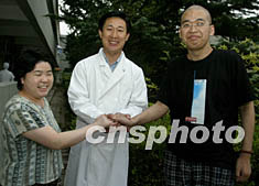 北京SARS醫療專家、人民醫院ICU主任安友仲教授,8月15日到北京地壇醫院祝賀將于16日出院的中國最后兩名SARS康復患者孫崢(右)、盧志艷(中)。安友仲教授曾在過去的三個月內分別參予這兩名患者的轉院搶救治療。中新社記者:任晨鳴