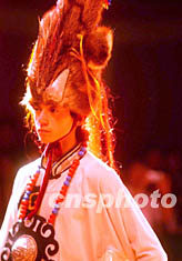 四川省風(fēng)景名勝九寨溝的民族藝術(shù)團(tuán),在夏秋旅游旺季的晚會(huì)上展示昔日羌族寨主的服飾風(fēng)采。中新社記者:賈國(guó)榮