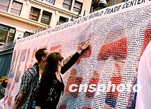 美東時間九月十一日,數以千計的普通市民前往紐約世貿中心廢墟遺址,憑吊兩年前“九一一”恐怖襲擊事件中的遇害者。圖為遇害者親屬撫摸鐫刻在大理石墻上的親人的名字。作者:龔文謨