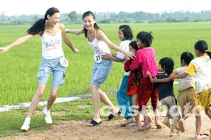 參加第五十三屆世界小姐中國總決賽的選手十六日拍攝外景時,在三亞鄉間與農家孩子玩起“老鷹捉小雞”的游戲。中新社記者:毛建軍
