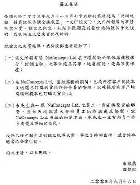 (一)該文所指有關NuConcepts Ltd.在中環開設的家俬店鋪被銀行“封鋪追租”之事件絕無其事,純屬捏造,毫無事實根據;(二)在NuConcepts Ltd.重組業務的期間,已為所有客戶就提取及送遞已訂購的貨品作好妥善的安排,以確保所有客戶均能順利提取已訂購之貨品;(三)朱先生與一眾NuConcepts Ltd.之員工一直保持緊密的聯系,并每天均與其大部分員工保持溝通及接觸。就NuConcepts Ltd.重組的細節方面,朱先生一直有向員工作出清楚及詳細的交代。