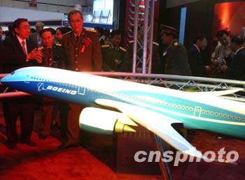 波音租用了若大的展位,重點展示了載客二百至二百五十人的新型波音7E7夢想飛機的模型,該機以安靜的發動機、可再循環使用的材料成為波音的“環保先鋒”。此外,該飛機具有比亞音速飛機更快的速度,體現了波音點到點的直飛理念。他們還放言,此飛機具有空客A380不可比擬的駕駛艙新技術。