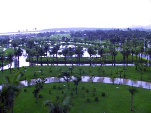 事實上,當記者站在酒店總統套房的大露臺上,心曠神怡的感覺真是撲面而來。在這個露臺上俯瞰酒店的生態泳池,綠色的島嶼小品與棕色木質燒烤回廊講述著回歸自然的故事;視野穿過起伏的高爾夫球場,可以遠眺南中國海的碧波。一條被河流沖積泥沙與外海海浪共同作用而成的沙堤——玉帶灘,蜿蜒三公里將萬泉河、龍滾河、九曲江三江入海口分成了內外咸淡兩海,其中內海之中形成若干個小島,在眼前演繹著豐富而多變的江、河、湖、海、島嶼、山脈的水域景觀。