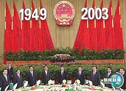 溫家寶總理在招待會上講話。他說,今年是中國人民在中共十六大精神指引下闊步前進的一年,是經受嚴峻考驗并取得重大勝利的一年。